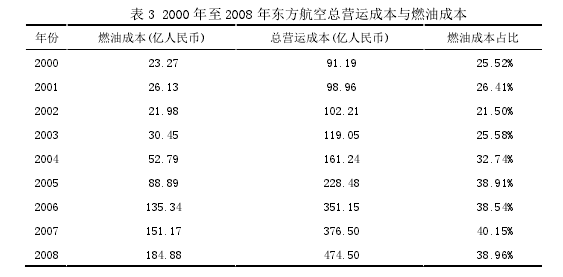 中國東方航空公司是在 2008 年前這一輪國際油價的上漲過程中受影響較大的一家航空公司。從表 3 與圖 4 中分別顯示出的 2000 年至 2008 年東方航空的燃油成本與營運成本及其變化,可以知道東方航空受國際油價上漲的影響之重。在 2002 會計年度,燃油的成本占公司營運成本的比例為 21%;而到了 2007 會計年度,這一比例已經上升到40%。無論是燃油成本上漲的幅度或是速度,都對東方航空的業績產生了很大的影響。進入 2000 年之后燃油價格的飆升嚴峻地威脅到了東方航空的成本及其組成結構,降低了公司的經營業績,削弱了公司的經營效率。從公司歷年的財務報告中可以知道,自 2003 年起,東方航空開始研究利用原油期權開展套期保值業務,目的是規避國際油價的風險,并且該業務從 2005 年起實施,關于燃油套期保值業務的詳細披露也是從 2005年開始的。東方航空的財務報告顯示,隨著國際油價的快速上升,雖然東方航空的燃油成本受到很大的壓力,但直到 2008 年 6 月份之前,即國際油價開始快速下跌之前,東方航空一直能夠從燃油套期保值業務中獲得收益。根據東方航空與國外投資銀行簽訂的期權合約,2005 會計年度,東方航空需要購買的燃油數量大約為 260 萬桶,價格在每桶41 美元至 70 美元之間,并以每桶 33.5 美元至 87.25 美元的價格出售約 684 桶燃油。2006會計年度東方航空將以每桶 54.75 美元至 95 美元的價格購買燃油約 1069 萬桶,并以每桶 40 美元至 115 美元的價格出售燃油約 2331 萬桶。到了 2007 會計年度,東方航空需以每桶 50 美元至 95 美元的價格購買燃油約 798 萬桶,并以每桶 43 美元至 115 美元的價格出售燃油約 230 萬桶。