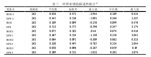 表三是對定向增發前一年至定向增發后三年公司的凈資產收益率和每股收益所作的描述性統計,“ROE-1、ROE、ROE1、ROE2、ROE2、ROE3”分別代表定向增發前一年、當年、后一年、后兩年、后三年的凈資產收益率;“EPS-1、EPS、EPS1、EPS2、EPS3” 分別代表定向增發前一年、當年、后一年、后兩年、后三年的每股收益。由表可觀測出,代表公司經營業績的凈資產收益率及每股收益都在定向增發當年達到最大值。在定向增發當年公司的凈資產收益率均值達到 0.109,而每股收益達到 0.513。對于凈資產收益率這個變量來說,定向增發前其均值為 0.056,在定向增發當年其均值達到最大后,隨后三年雖然均值較定向增發當年有下降,但是不管是定向增發后第一年、第二年還是第三年,其均值均大于定向增發前一年的值。但是對于每股收益來說,其描述性統計的值恰恰相反。在定向增發前,平均每股收益為 0.445,在定向增發當年達到 0.513的極大值后,公司的每股收益不斷下降,并且定向增發后三年的每股收益均是低于定向增發前的每股收益。