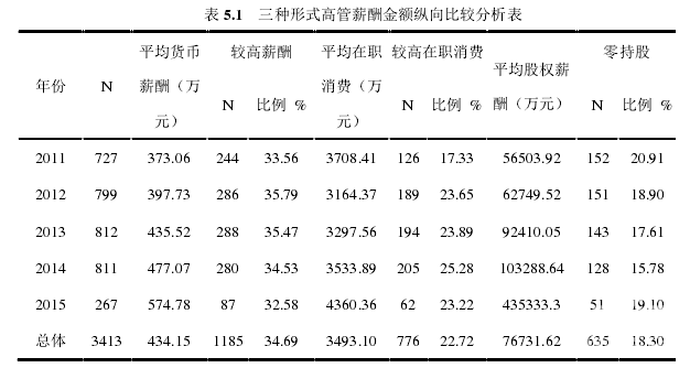 表 5.1 縱向描述了 2011 年至 2015 年三種高管薪酬形式的金額,在符合條件的 3412個樣本數據中,除了 2015 年數據較少外,其他各年數據都較為均勻。為了消除絕對數存在的弊端,本文在分析變化趨勢時均采用相對值,即百分比進行分析。由表可知,我國貨幣薪酬、在職消費、以及權益薪酬數量,在 2011-2015 年均呈總體上升趨勢。平均貨幣薪酬增長幅度較大,從 2011 年的 373.06 萬元,增長到 2015 年的 574.78 萬元,增長幅度接近 100%。平均在職消費水平近年來平穩增長,說明盡管上市公司結構在不斷完善,管理層通過在職消費來侵蝕股東財富的行為仍未得到有效的控制,在職消費現象依舊嚴重。股權薪酬發展速度極快,零持股比例呈總體下降趨勢,2014 年平均股權薪酬甚至達到了 10 億,與 2011 年相比翻了一番,是當年貨幣薪酬的 216 倍,是在職消費的29 倍,這說明股權激勵在我國越來越受到上市公司管理層的重視,得到廣泛和深入的實施,大部分企業實施股權激勵的積極性明顯提高。
