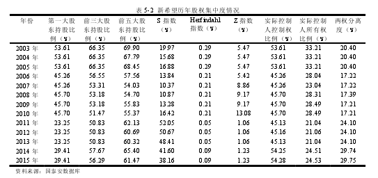 股權結構一直是公司治理核心問題,股權結構代表上市公司權力構成及其所占比例,股權結構如何安排直接關聯著上市公司剩余控制權和剩余所有權,引導著其股東在公司治理中的行為選擇和傾向,從而牽制著決策和執行層的決策實施及多元化效果。 現有研究量化股權結構主要從股權構成和股權集中度兩方面切入。前者通常借助上市公司流通股比例等指標量化;后者通常以第一大股東持股比例、S 指數和 Herfindahl 指數等指標進行衡量。本文在現有研究基礎上從以上兩大方面深入分析新希望集團自上市以來股權結構情況及變化歷程。 從表 5-1 可以看出,新希望集團股權構成主要為境內發起人法人股和流通股兩部分。自 2001 年到 2015 年間,公司股權構成比例大致呈現境內法人股比例趨于減少而流通股比例不斷增加態勢。其中,2007 年之前,發起人法人股比例一直保持在 50%以上,即這些年間新希望創始人家族始終保持絕對控股地位;2007 年之后,發起人法人股比例開始逐漸減少并且一直保持低于 50%。 值得注意的是:自 2008 年開始,新希望集團所持有法人股比例大幅減少,特別是2009 年和 2010 年兩年,公司法人股比例變為 2.03%。主要是因為新希望集團于 2007年將所持有占公司總股本 8.11%的 5 千萬余股有限售條件流通股質押給國家開發銀行以換取項目經營及投資資金;其次,公司于 2008 年 11 月 7 日將質押股份中的 4 千萬余股解除質押上市流通,其余 1 千多萬股繼續質押,使得 2009 年和 2010 年集團持股比例急劇縮??;另外,2011 年新希望集團發行新股共 9 億余股,其中包括法人股 898958864 股,使得法人股比例有很大幅度上升。在這個變化趨勢中,體現公司致力于新業務開拓和新項目開發,公司治理致力于減少家族控制影響因素,開始善于運用外部市場要素經營生產,優化股權結構促進市場化進程,提升公司治理質量和效率,這也成為十幾年間新希望集團快速成長和多元化發展不可忽視的貢獻因子之一。
