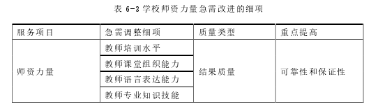 本文針對 D 機構教育服務改進出了四個具體的改進方向:(1)資源再配置;(2)再學習;(3)服務方式改進;(4)提高標準化要求。 在此基礎上將各服務要素劃分到不同的服務改進方向之中具體服務要素改進方式歸類見表 6-1: 確定各服務要素的具體改進方向以后,我們需要對各服務要素進行改進完善等級劃分,以確定各服務要素進行服務改進完善的次序。我們依據之前得出的各服務要素綜合重要度得分作為劃分其改進完善等級的參考標準,參照各服務要素得分的分層情況,對各服務要素改進完善等級具體劃分標準規定如下: 綜合重要度得分大于-0.1 分的服務要素,劃分為優先改進完善;綜合總要度得分大于-0.01 小于-0.1 的服務要素,劃分為次改進完善;綜合重要度得分小于-0.01 分的服務要素,劃分為可以待改進完善。 我們知道商業運營過程中的顧客對服務過程和結果的滿意度可以用五個維度來評價,即可靠性、有形性、響應性、保證性、移情性方面來評價,在此我們結合這五個維度來分析教育培訓機構服務質量,以便系統全面的提高。下文將結合客戶感知服務質量的五個維度來分析具體提升中小學課外輔導培訓機構主要服務細項的措施。