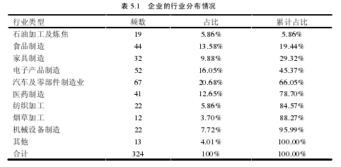 本研究大樣本調查的正式問卷回收后共獲得了有效樣本 324 份。為了更清晰的展示樣本的總體情況,本部分對研究的企業特征、個體特征和所有變量進行描述性統計分析。樣本企業覆蓋了東北地區、長江三角洲地區和珠江三角洲環的石油加工及煉焦業、食品制造、家具制造、電子產品制造、汽車及零部件制造、醫藥制造、紡織加工、煙草加工、機械設備制造等行業,基本上可以代表制造行業企業整體情況,具體分析情況如表 5.1 所示,汽車及零部件制造業占比最高為 20.68%,食品制造、電子產品制造、醫藥制造行業企業占比均超過了 10%以上,石油加工及煉焦、家具制造、紡織加工、煙草加工、機械設備制造行業企業占比均在 10%以下,其他行業企業占比 4.01%。 員工人數是管理學研究領域對企業行為有重要影響的企業特征之一,是反映企業規模的重要指標。如表 5.2 所示,研究樣本具有較大的分散性。在企業規模分布上,100 人以下占 10.80%,101-500 人占 17.59%,501-1000 人占 38.27%,1000 人以上占 33.33%。
