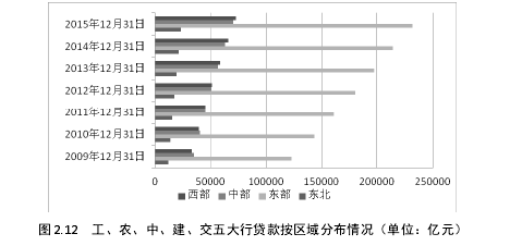 本文選取的第二個角度是區域,分析五大行信貸資金的區域分布有助于了解其對各個區域不同的信貸投資力度,了解其信貸客戶的區域集中度等信息。作者結合行政區域的劃分以及各行年報的統計口徑,將我國境內分為東北、東部、中部和西部四個區域,各個區域具體包含省份參見注釋。中部和西部地區的貸款余額占全部貸款余額的比重幾乎相當。但從趨勢上來講,西部地區貸款余額的占比逐年提高,2015 年年末相比 2009 年年末增加了近 2 個百分點;而中部地區每年年末貸款余額占全部貸款余額的比重浮動微小,在選樣期間幾乎持平。截止到 2012 年 12 月 31 日,西部地區貸款余額首次超過中部地區貸款余額,成為占比第二高的區域。以上表明五大行的信貸資金流向中部和西部的份額相差不多,但近些年信貸結構的調整方向更偏向于西部區域,西部地區貸款余額的增長一直高于貸款余額的整體增長水平。