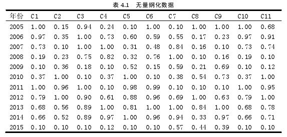 除“工業用水重復利用率”和“廢氣排放量”這兩項指標來源于青海省環境保護廳監測系統之外,本文的其他指標數據都來源于 2005 年至 2015 年的《海西州統計年鑒》。按照 3.3.1 中所指出的無量綱化公式,對原始數據進行處理后結果如表 4.1 所示。需要說明的一點是,自 2011 年起,我國環境保護部對環境統計口徑作出了調整,為使得所有的數據具有縱向可比性,本文將 2005 年至 2015年環境績效評價分成 2005 年至 2010 年和 2011 年至 2015 年兩個階段。按照 3.3.2 所列出的權重確定方法,計算各項指標的權重。首先,向專家發放評價指標比較調查表——《柴達木循環經濟試驗區工業企業環境績效評價指標比較調查表》。本次調查一共邀請了 6 位專家,其中,1 位來自政府部門,2位來自研究機構,3 位來自高校。由層次分析法計算的權重計算結果如表 4.2 所示。