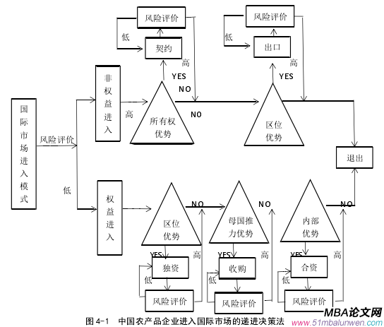 農產品企業本身具有進入國際市場風險大、價格操作選擇余地有限、決策具有偶然性和進入模式選擇被動等特點,這些特點直接導致其國際市場進入模式選擇與實力雄厚的大型跨國制造業企業存在很大不同。農產品企業在選擇國際市場進入模式時的一個顯著特點就是缺乏國別專有知識,對國際市場的政治條件、法律制度、消費者的習慣偏好等因素不熟悉。這可能給農產品企業的經營造成很大的風險。所以進入風險可以作為企業選擇權益進入或非權益進入的關鍵因素。當風險太高時,企業就會選擇退出國際市場。比如像伊拉克和阿富汗等經常發生戰爭的國家,企業會選擇退出。如果進入風險較高,企業往往選擇非權益模式進入目標市場。比如,對伊朗和南斯拉夫這樣政治穩定性不強、購買力較低的國家,企業一般選擇了貿易方式而不會在這樣的國家建立工廠。在選擇非權益模式進入后,如果農產品企業具有技術或品牌優勢等所有權優勢,且可以防范核心技術被擴散出去等風險,則企業可以進一步選擇契約模式進入目標市場。否則企業只能憑借目標國區位優勢以出口方式進入。如果進入的風險較小,企業就會在目標市場進行權益投資,為發揮內部優勢而選擇合資方式;在母國推力優勢和區位優勢的基礎上企業會選擇收購和獨資的模式。