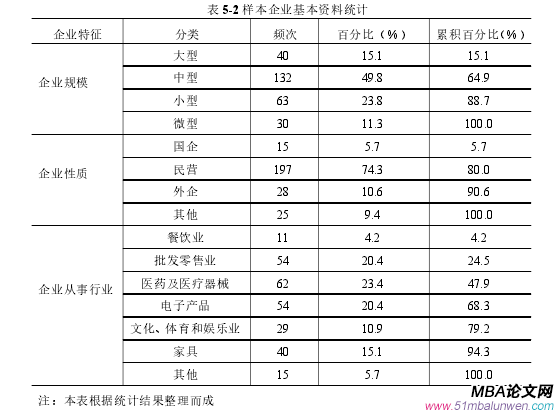 如表 5-1 所示,本研究收集的 265 份有效樣本中,從調查對象的性別分布來看,男性占有效樣本總數的 72.8%,女性調查對象占 27.2%,男性明顯偏高于女性;在年齡結構方面,其中在 36-45 歲之間的調查對象人數最多,占樣本總數的41.9%,其次是介于 26-35 歲之間的調查對象,占樣本總數的 28.7%,25 歲以下和 56 歲以上的調查對象分別占 10.6%、1.1%;對于調查對象的文化程度情況,本科學歷的人數居多,占有效樣本的 62.3%,其次是大專及以下學歷,比例為27.5%,碩士及以上的人數占 10.2%;從問卷填答者的職位分布來看,包括 54%的部門經理、23%的總經理、19.6%的主管和 3.4%的業務員,總經理和部門經理占被試總數的 77%。綜合以上分析,本研究在調查對象的選擇上較合理。