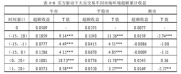 (2)股票市場投資者基于買賣驅動、折溢價、標的股票規模、交易動機以及市場環境等不同市場微觀因素,大宗交易發生對股價超額收益影響也不同。這也暴露出了我國股票市場尚不成熟,投資者極不理性的一面,完善我國股票市場大宗交易制度之路任重道遠。在大宗買賣行為方面,本研究發現大宗買賣會對股票價格效應產生不對稱影響,即大宗買入會對股價產生持續積極影響,而大宗賣出會對股價產生暫時的消極影響。這與國內外專家學者研究成果一致,不同之處在于這種不對稱影響發生在大宗交易之后,而在之前不論大宗買入還是大宗賣出都會帶來顯著的積極影響,本文認為這與投資者炒作、跟風、內幕信息泄漏等一些市場不成熟因素有關。在大宗折溢價方面,本文發現大宗交易帶來的累計超額收益與折溢價率大致呈現正相關,但溢價高到一定程度后,大宗交易帶來的超額收益未必越大,本文認為高溢價的大宗成交大多基于投資者個體交易動機,其大宗交易對其他投資者帶來的影響不大。在大宗交易標的規模方面,股票標的規模越小,買方驅動下大宗交易對股價帶來的積極影響越大,賣出驅動下大宗交易對股價的消極影響越大。在大宗交易動機方面,大股東對公司未來發展有信心而在大宗交易平臺增持、大股東因公司治理結構因素而在大宗交易平臺減持,這兩種交易動機會對股價帶來持續積極影響,大股東因解禁在大宗交易平臺減持,則會給公司股價帶來暫時性消極影響。在大宗交易市場環境方面,市場環境越好,大宗交易對股價的積極影響就越大,原因在于牛市環境下包括大宗交易在內的任何事件都有可能被當成炒作對象,而熊市中大家對包括大宗交易在內的任何事件都比較謹慎,以觀望為主。