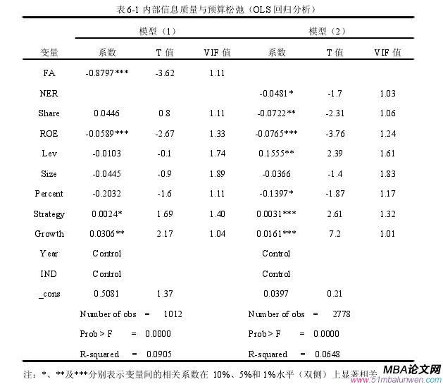 (2)本文使用兩種內部信息質量的替代變量進行了回歸檢驗,兩組檢驗結果與假設 1 一致,即內部信息質量與預算松弛顯著負相關。也就是說企業的內部信息質量越高,企業的預算松弛程度越低。這是因為,當企業的內部信息質量越高時,企業內部信息的獲?。ㄕ业叫畔ⅲ┖驼希ㄔu估信息作業)做的更好,預算上級就能夠獲取更多有利于預算制定的信息,預算下級也減少了隱藏信息的機會主義行為,進而降低了預算上下級之間的信息不對稱,降低了預算松弛程度。