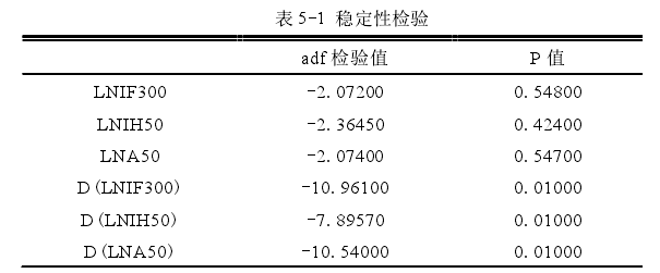 本文的研究標的是在境外新加坡國際交易所上市的富時 A50 指數期貨和境內中國金融期貨交易所上市的滬深 300 指數期貨和上證 50 指數期貨。期貨價格使用連續的主力合約日收盤價格。本章節數據的選取時間段為 2015 年 4 月 16日到 2017 年 7 月 20 日。與其他基礎性的金融產品不一樣,期貨合約在上市的時候就規定了它的到期時間,如果期貨到期,合約就會取消,從而導致每一張合約會有間斷點。而且,同一天在市場上存在著多張到期日不同的期貨合約。所以,一個股指期貨品種在同一時間會有多個不同到期日合約的價格。如果要研究期貨價格的時間序列,我們需要對合約價格進行處理:選取當月的主力合約價格,當合約進入到期的交割月時,選擇次月的合約價格,進而得到一個沒有間斷點的期貨價格時間序列,并且這樣做還可以避免到期日效應的影響。還有一點。由于境外交易所(新加坡國際交易所)的重大節假日休市制度與境內交易所(中國金融期貨交易所)具有一定的差異,為了得到一一配對的價格數據,本文對不匹配的數據進行了刪減,從而取到 552 對富時 A50 指數期貨和滬深 300 指數期貨的數據序列;同樣的,富時 A50 指數期貨和上證 50 指數期貨的數據序列也是 552 對。(富時 A50 指數期貨;滬深 300 指數期貨;上證 50 指數期貨的數據均取至文華財經數據庫)開始正式的實證過程之前,我們先對三個股指期貨時間序列的穩定性進行了檢驗,并且考察了它們的基本統計性質。(價格取對數,分別為 LNA50、LNIF300、LNIH50;收益率為一階差分,分別是 D(LNA50), D(LNIF300),D(LNIH50))。穩定性檢驗如下表 5-1 所示;統計量如下表 5-2 所示。