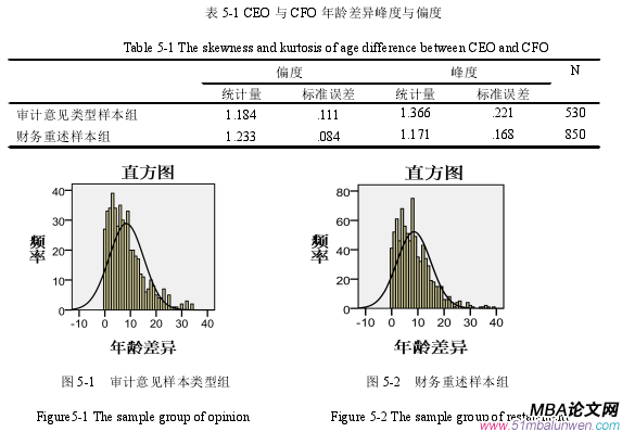 樣本數據服從正態分布是進行一系列實證分析的重要前提條件,因此,在進行分析前,有必要對選取的關鍵變量進行正態分布檢驗,從而保證假設檢驗結果的準確性和有效性。由于本文中多個變量都為邏輯變量,所以選取部分關鍵非邏輯變量進行正態分布檢驗,借鑒以往學者的正態分布檢驗方法,在通過對直方圖進行直觀觀察的同時,考慮變量偏度值和峰度值的大小。具體如下所示:從表 5-1 中可以看出,無論是審計意見類型樣本組還是財務重述樣本組,CEO 與CFO 年齡差異的峰度值和偏度值均接近于 0,說明該變量的分布接近正態分布。圖 5-1和圖5-2表示的兩個樣本組的直方圖均證明了CEO與CFO年齡差異的分布大致具備正態性。在本文中,公司規模除了作為控制變量外,還作為選取配對樣本時的主要衡量標準,由此形成審計意見類型樣本組和財務重述樣本組。參照以往學者的相關研究,本文選取上市公司上一年年末資產總額的自然對數作為衡量公司規模的指標。