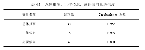 所用量表的質量較高,才能保證所收集數據的準確性。因此,本文首先對量表的信度和效度進行檢驗,以保證量表的質量。本文采用 Cronbach 內部一致性系數(α系數)方法來檢驗各個量表的信度,量表的 Cronbach's α系數大于 0.8 時,表明量表具有較好的信度。從表 4.1 能夠看出,總體報酬量表、工作倦怠量表的 Cronbach’s α系數均大于 0.9,離職傾向量表的 Cronbach’s α系數大于 0.8。創業意向量表的 Cronbach’sα系數為 0.897,而題項 CY_4(我做生意時會盡最大的努力)的項已刪除的Cronbach’s α系數為 0.919,所以,將題項 CY_4 刪除,刪除后創業堅持構念的Cronbach’s α系數為 0.919。因此表明本文所使用的量表內部一致性比較理想。從表 4.3 可以看出,總體報酬量表、工作倦怠量表、離職傾向量表、創業意向量表的 KMO 值都在 0.8 以上,各自的 Bartlett 球形度檢驗 sig 均為 0.000 顯著,因此,本文認為總體報酬量表、工作倦怠量表、離職傾向量表、創業意向量表的效度都較好。