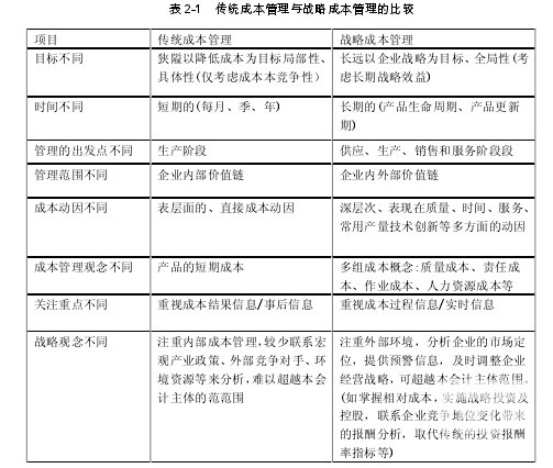戰略成本管理的目標就是戰略成本管理活動所期望達到的目的,它是指導戰略成本管理活動的方向和評價戰略成本管理活動是否合理有效的基本標準[15]。對于戰略成本管理的目標應從三方面進行考慮:一是,戰略成本管理目標應服從于戰略管理目標;二是,戰略成本管理的目標要符合成本管理自身的功能特征;三是,戰略成本管理的最終目標還應該落實在公司成本管理的持續降低上[16]。 綜合以上分析,將戰略成本管理的目標如下定義:戰略成本管理的目標就是通過戰略性成本信息的提供與分析利用,服務于公司戰略管理,并以此促進公司競爭優勢的形成和成本的持續降低[17]。戰略成本管理是戰略思想在成本管理中的具體應用,使在提高企業競爭優勢的同時進行的成本管理,也就是說不僅要降低成本,更要注重與企業的競爭戰略相配合,以保持企業的競爭優勢。戰略管理對象應包括企業的整個價值鏈管理,戰略成本管理具有以下幾個特點:戰略成本管理重視公司與市場的關系,具有開放系統的特征;戰略成本管理重視公司競爭優勢的形成,具有競爭性的特征;戰略成本管理將視角擴大到公司整體,具有結果控制與過程控制相結合的特征;戰略成本管理的時間應超越一個會計期間,具有長期性的特點;戰略成本管理重視對公司顯性成本與隱性成本的管理,具有全面性的特征;戰略成本管理重視公司文化的建設,具有個性化的特征[18]。如表 2-1:傳統成本管理與戰略成本管理的比較: