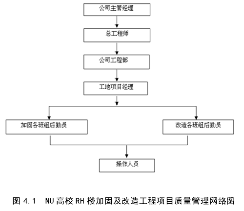 滿足招標合同中對施工質量的要求,依據合同規定的條款和與本工程相關的規范對工程施工質量進行控制和評定,保證工程施工質量符合相關規定的合格標準。針對 NU 高校 RH 樓加固及改造工程項目的質量問題,提出了解決的具體方法。為了更好的保障質量措施的執行,必須有完善的質量管理保障體系。 提高全員質量意識是保證項目質量的第一要素,只有員工樹立了質量意識,才可能會使項目質量管理工作得以順利開展。而且,項目的質量也直接關系到業主的生命和財產安全,同時也關系到公司的聲譽。因此,必須要是重視項目質量在,在施工人員中樹立“質量第一”的意識。 建立完善的質量保證體系的保障項目質量的基礎工作,只有建立健全質量保證體系,才能使質量管理工作做到有章可循,有法可用。對于質量保證體系的建設,要各級領導都要規劃,做到三級質量保證體系,確保使規劃目標落實到個人。