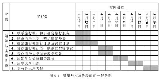 南寧市C局于2012年5月下旬組織一次省外培訓,培訓計劃的主題擬定為“領導能力提升”,在2011年9月呈報培訓計劃,2011年12月計劃獲批,確定培訓實施機構為清華大學。2012年3月初,培訓實施工作開展,首先對整個培訓項目進行了培訓工作的周密策劃,工作的每個環節如何開展,時間安排,注意事項以及目標達成等在策劃書中有明確體現,如:培訓組織與實施階段的時間—任務進程如下圖5-1所示:在訪談后對本次培訓的參訓干部的基本情況,對培訓的基本需求有了初步的了解,于3月中旬設計調查問卷,進一步掌握參訓干部的培訓需求(問卷設計見附錄)。問卷發放40份,回收28份,為有效樣本數量,對問卷調查結果進行了認真分析,并撰寫調研報告,報告中對問題的分析準確、全面,部分題目的分析樣式如下:問題:您領導與管理的工作中,遇到的突出問題有哪些?南寧市城管部分報送的培訓需求調研報告審核通過后,經過一番比較和詢價,最終選擇了南寧市Q旅行社作為這次培訓的服務機構。培訓于2011年5月下旬如期舉行,在培訓過程中,對培訓課程也有詳細的評價,并在本單位的網站上發布了培訓的相關報道。在整個培訓過程中,培訓管理非常到位,培訓服務的各項工作均有具體安排,以人員組織分工為例,培訓項目負責小組列出詳細的分工明細.