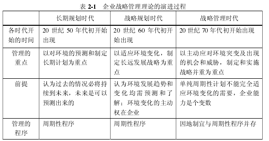 戰略管理理論是管理學整體理論中一門較新的學科,是在總體管理理論基礎上順應時代的要求而逐漸發展起來的。他是與長期規劃理論的雛形,逐漸演進到戰略規劃,最后發展成既包括戰略決策和制定,又包括戰略實施和控制的全面地、系統的戰略管理理論,而且隨著時代的進步,這一理論仍處于發展完善之中。表2-1 具體列出了企業戰略管理理論演進的階段及其主要特征。