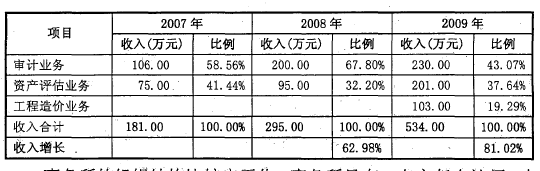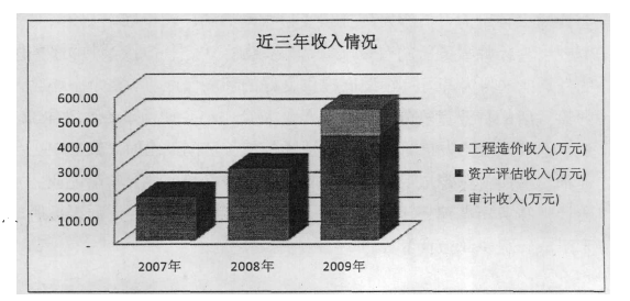 A事務所成立之初以審計為主要業務,然而隨著近幾年事務所將業務范圍不斷橫向延伸,2007年增加了評估業務,2009年增加了工程造價咨詢業務,A事務所出現了高速發展的趨勢,近三年事務所的收入情況如下: