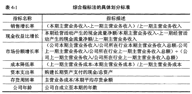 本文選用Aharony&Ramesh的模型中的銷售增長率、資本支出率和公司年齡作為劃分標準,并增加若干其他財務指標,具體有現金收益比增長、市場份額增長率、成本降低率、存貨周轉率。之所以刪除原有的股利支付率指標,是因為我國上市公司的股利分配具有很強的政治色彩,大多是為了滿足證監會規定的增發、配股要求,與企業生命周期旳股利支付規律不一定相符合。本文的七個劃分標準具體見表4-1。?