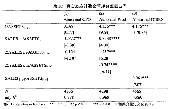 如表5.1所示,對于模型(1)至模型(3),本文釆取了分年度分行業回歸,由于受到本文的篇幅影響,所以只報告了全樣本回歸的結果。如表所示,異常經營現金流(Abnormal CFO)分離模型、異常生產成本(Abnormal Prod)以及異??刹僮髻M用(Abnormal DISEX)三個分離模型修正后的R-square,分別高達0.778、0.968及0.869,說明本文的模型中解釋變量可以很好的解釋正常范圍內經營現金流、生產成本及可操控費用水平或規模,都具有很高的擬合優度。同時,相關系數顯著性值都較高,部分相關系數顯著水平高達1%,這說明Roychowdhury (2006)的模型可以通過回歸檢驗,對我國上市公司也具有較強的適用性。