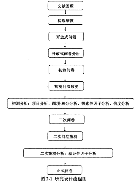 文獻回顧國內外相關領導力的思想、理論,以及開放式問卷收集大學生領導力的表現形式,提取出相關的題項,構成大學生領導力初步問卷。通過對問卷的初步施測和對測量結果統計,確定大學生領導力結構,并形成正式問卷。最后,正式施測,分析了解大學生領導力的現狀。詳細研究設計見下圖2-1。