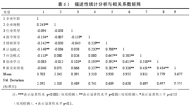 本研究在對數據進行多元線性回歸分析之前,先對文中所涉及的主要變量進行簡單描述性統計和 Pearson 相關分析,結果如下表 6.1 所示。表 6.1 的數據顯示,各個變量的均值和方差都處于合理范圍內。并且,Pearson 相關分析結果顯示,創業者領導行為(指令領導和授權領導)和戰略形成(計劃模式和應急模式)存在相關性,戰略形成(計劃模式和應急模式)與新企業績效存在相關性,這初步表明了這些變量間存在關系。