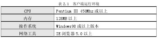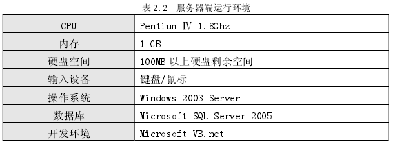 本系統是以 Windows 系統為操作平臺,用 VB.net 編程語言做網頁界面,同時用腳本語言做網頁界面與底層數據庫的互聯,用 SQL Server 數據庫來實現高等職業衛生學校學生宿舍管理系統所需功能的。同時,在系統的開發中,我們充分考慮到有些高等職業衛生學校由于在終端資金的投入等諸多因素,因此在硬件要求上不做苛刻要求,具體運行環境見表 2.1 及2.2。