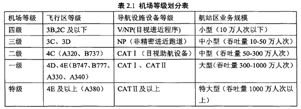 民航機場等級反映了機場最大的運行能力,包括能接收機型的大小、客貨運量的大小、保證航班正常率和飛行安全的導航設施設備的完善程度。在綜合三類標準的基礎上,我國劃分了五個機場等級,具體內容見表2.1,本文研究主要針對二級以上機場來開展。