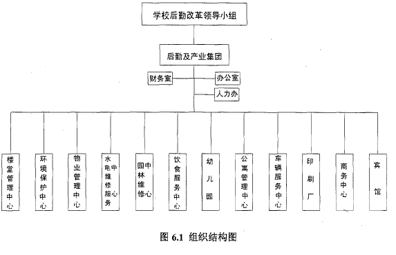 X大學是四川省重點建設的師范大學,己有六十余年辦學歷史。校園占地面積2476畝,建筑面積91.9萬平方米,學?,F有在職教職工2054人,在校全日制本??茖W生、研究生和外國留學生30343人。2000年,為貫徹落實教育部《關于進一步加快高等學校后勤社會化改進的意見》,X大學在全省率先進行了后勤社會化改革,將原總務處整體剝離組建了后勤服務總公司;2003年,又將后勤服務總公司、科技開發總公司、校醫院合并組建成后勤及產業集團。2007年6月,校醫院從后勤及產業集團分離,成為學校的一個行政部門?,F在集團下設十四個科級建制單位,現有職工800余人,擔負著學校三萬余名師生員工的后勤保障工作,其組織結構圖如6一1所示:?