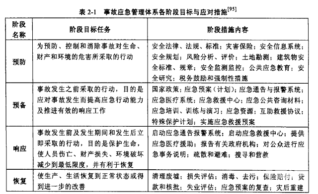 事故是指由于物質(或自然)的不安全狀態和人的不安全行為而發生,并導致人員死亡、傷害、疾病或財產損失的偶然、突發性事件。絕大多數傷亡事故是可以預防的,預防效果比應急救援效果更好,應加強事故預防工作,防止緊急事件或事故發生,以減少應急行動。事故預防首先要求建立完善的安全法規、標準和防災政策體系;其次,應做好危險辨識、風險分析評估、監測監控、安全檢查與隱患整治等工作。雖然事故可以預防,但在一定技術與管理條件下,還可能有事故發生,因此必須為事故應急救援做好應急計劃與準備,包括應急救援系統的建立、應急預案的編制等。一旦事故發生,根據應急預案的響應程序和內容要求啟動應急救援系統。應急響應就是出現緊急事件時為控制或減輕事件后果而采取的緊急行動,包括應急通告報警、應急救援、應急疏散等。應急響應是一個過程,具體響應級別標準、響應程序、響應人員、應急處置措施等應按應急預案要求確定。應急響應之后需進行現場清理,使生產系統恢復正常狀態,并對事故情況進行評估。這樣就形成完整的應急管理循環。當然,在實際應急管理中,這4個階段(要素)有時是重疊的,并不一定絕對獨立。