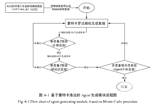 Agent 生成模塊主要由兩步串聯的步驟構成:第一,利用蒙特卡洛發隨機生成所有 Agent各個因素(變量)的具體值(具體方法見 5.3.1部分),數據生成的關鍵統計量(如均值、方差等)根據村層面的調查樣本參數進行設定。第二,對生成的變量值做多尺度統計檢驗。統計檢驗具體包括單變量參數檢驗與多變量相關性檢驗兩方面內容,參考 Berger and Schreinemachers(2006)的檢驗準則,單變量參數檢驗將在總體層次(即整個研究區域)與聚類層次(即鄉鎮層)開展,而多變量相關性檢驗將在 Agent 個體層次開展。隨機數的生成需要通過所有檢驗,否則 Agent 生成模塊將重新運轉,直至生成的所有變量值符合標準為止(圖 6-1)。