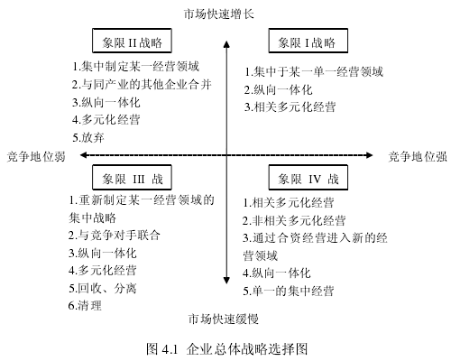 投資戰略是企業戰略管理的重要部分,其選擇與實施需要與企業戰略目標一致,并支持企業總體戰略的選擇。企業投資戰略是企業總體戰略中較高層次的綜合性子戰略。企業總體戰略主要分為發展戰略、穩定戰略和收縮戰略。相應地,企業投資戰略也可劃分為發展型投資戰略、穩定型投資戰略以及收縮型投資戰略。美國學者格魯克經過 45 年對 358 位經理的戰略選擇進行詳細分析后指出,選擇發展戰略的企業超過研究對象的半數,只有不到 8%的企業選擇收縮戰略。此外,還有近 30%的企業選擇綜合型或其他戰略。本論文在第三章中已經對華盛天誠醫院管理公司的宏觀環境及微觀環境進行了分析,此處可以利用企業總體戰略選擇圖,選擇“市場迅速增長”、“競爭地位”兩個維度輔助企業總體戰略的選擇。根據前文的分析,華盛天誠醫院管理公司目前所處環境市場增長迅速,但是公司自身的市場競爭能力不強,市場占有率較低。因此可以判斷,華盛天誠醫院管理公司的總體戰略目標選擇應該偏向第二象限,或者可以在第 I 和 II 象限交接的位置,即公司可以選擇集中戰略或者一體化戰略,以及多元化戰略。一體化戰略是企業沿著經營鏈條縱向或者橫向的擴展業務的深度和廣度??v向一體化戰略是企業通過向上、下游擴展業務而節約交易成本,控制稀缺資源,保證關鍵投入的質量以及獲得新客戶等。一體化戰略通常適合上、下產業的增長潛力較大,利潤率較高;與上、下游交易成本較高的企業。此外,企業還要具備一體化戰略所需的資金、人力資源等。華盛天誠醫院管理公司所處的行業其上游供應商主要是藥品、器械、設備等生產企業。該上游行業競爭激烈,議價能力較差。華盛天誠醫院管理公司雖然可以通過并購等方式實現縱向一體化,但并不是最佳選擇。一方面,上游行業競爭激烈,可獲利水平一般,另一方面,前向一體化戰略可能占用公司大量的資金和人力、物力,增加資產的專用性,增加企業的退出成本;同時公司要面臨不熟悉新業務的風險。其下游客戶基本為普通患者,議價能力低,不具有后項一體化的必要性。