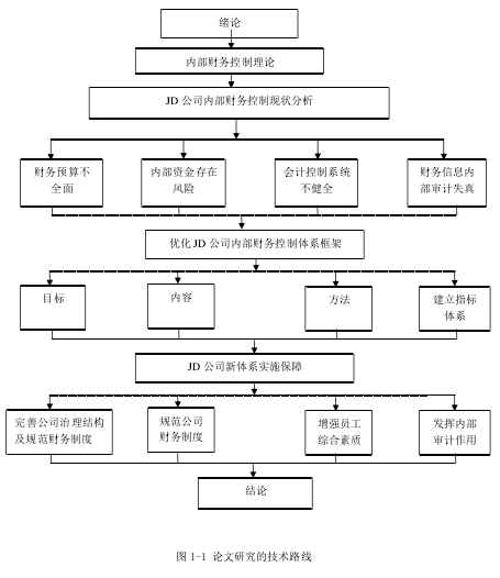 (2)現實意義。論文研究中,通過對JD公司發展歷程、相關的管理現狀進行梳理和分析,提出內部財務控制中存在的問題,尋找問題的原因,以此為基礎,構建JD公司的內部財務控制體系框架、提出管理重點,制定管理措施,建立并完善公司內部財務控制體系,對JD公司的健康持續發展建立制度保障和管理措施的支持,同時,能夠對同行業公司的企業內部財務控制制度建立起到一定的參考作用,研究具有很重要的現實意義。