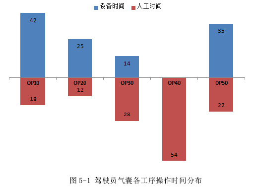 經過前兩章節的論述已經具備了對 TF 公司進行人工成本優化的理論依據。本章將通過運用上述理論依據進行實際實施,在實施過程中將工藝過程改善和工資制度改革相結合并同步進行應用,最終達到成本優化的目的。 為了使實施所能帶來的效果立竿見影從而使其能得到更深入的執行和推廣,具體的實施對象優先選取了公司產品中比較有象征性的駕駛員安全氣囊生產線。該同類產品在公司內共有 4 條生產線,每條生產線由 5 道工序組成,4條線的工藝過程基本相似。類似這種相對簡單且比較普遍、通過優化可以舉一反三的情況是建議優先考慮實施的,一旦優化取得成果,將會加倍得到體現。   在實施前,行動小組首先制定了實施計劃,選取其中一條線開始。內容如下: 1.  相關操作人員進行崗位評價(要素一); 2.  設備動作優化及操作時間測算; 3.  線平衡優化; 4.  新工藝過程按工序進行崗位評價(要素二-四); 5.  成本優化結果分析;其中,OP20 和 OP30 工位的節拍較短,每生產一個產品,兩個工序的操作人員分別會產生 23 秒和 26 秒的等待時間,效率浪費較高。我們將這兩臺設備的結構進行改造,將其合并為一個整體的工作臺,縮短運行距離。當 OP20 工位進入 25 秒的設備操作時間時,操作人員開始進行 OP30 的 28 秒接口操作。之后當 OP30 進入 14 秒的設備操作時間時,操作員再返回 OP20 進行 12 秒的接口操作。按此方式優化后,兩個工序合并后的節拍為 14(12)+28(25)=42 秒。最終的線平衡結果如圖 5-2。