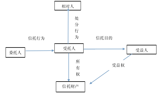 信托在不同的法律體系、不同的國家具有不同的詮釋。1我國現行《信托法》第 2 條規定:“信托是指委托人基于對受托人的信任,將其財產委托給受托人,由受托人按委托人的意愿以自己的名義,為受益人的利益或者特定目的,進行管理或者處分的行為。”據此,揭示了我國信托四個方面的基本內涵:一是信托以信任為基礎。在信托法律關系中,委托人基于對受托人的信任交付財產,受托人對受益人負有信任責任;二是信托以財產為前提。信托是以財產為前提的一種制度安排,無財產便無信托。信托關系中必須存在財產權的轉移和分離;三是信托以受托人為核心。這是信托之核心。在信托制度中受托人是以“信托財產所有權人”的身份和名義履行受托職責的,信托的功能和目的完全依賴受托人的行為而得以實現;四是信托以委托人意愿為目的。創設信托制度的目的是為了實現委托人的意愿,使受益人獲取利益或實現其他目的。我國關于信托的法律定義,除了揭示了信托的基本法律內涵外,也解釋了信托的基本法律構造要素。從信托的定義看,其法律構造可圖示如下: