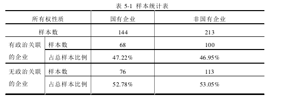 本文選取 2013 年中國滬深股市發生的股權并購交易事件中的并購標的公司為初始樣本,并以 2012 年、2014 年的相關數據分別作為并購前后指標參與實證檢驗,為確保數據的有效性,滿足研究的需要,本文按以下原則對樣本進行了篩選: (1)剔除并購交易沒有成功的; (2)剔除并購規模小于并購標的公司總資產的 5%的; (3)剔除并購一方為金融、保險行業的; (4)剔除相關數據缺失或異常的; 按照上面提到的要求對初始樣本進行篩選后,本文最終得到 2013 年滬深股市 357 個并購事件為有效研究樣本,具體情況如表 5-1 所示: 從表 5-1 可以看出,隨著全球并購浪潮的不斷推進,2013 年我國很多企業參與到了并購活動中。從并購活動中并購標的方的所有權性質來看,非國有企業多于國有企業。這一情況的出現可能與我國國有企業的特殊性分不開,國有企業比非國有企業承擔更多的政策性任務,以并購標的角色出現在并購活動中的概率可能更低。同時,近年來,非國有企業發展迅速,積極開展并購活動,有報道指出,非國有企業已成為海外并購的主力軍45。筆者發現,無論是國有還是非國有企業,有政治關聯的企業的比例都接近 50%,這說明政治關聯普遍存在于我國的上市企業中。 本文的數據主要來自國泰安數據庫(CSMAR)。其中并購交易數據來源于CSMAR 的中國上市公司并購重組研究數據庫;上市公司的財務數據來自CSMAR 的中國上市公司財務報表數據庫;上市公司的所有權性質來自 CSMAR的中國上市公司股東研究數據庫。對于上市公司高管的政治關聯數據主要是通過手工搜索獲得。具體的工作是先通過查閱 CSMAR 中高管的個人簡介并結合和訊財經中高管的個人簡介,然后通過百度搜索引擎核實數據。本文中的數據是通過EXCEL 進行初步處理,描述性統計分析、多元回歸分析和 t 檢驗分析通過 STATA12.0 予以完成。為了消除極端值的影響,對處于 0-1%和 99-100%之間的樣本數據進行 Winsorize 處理。