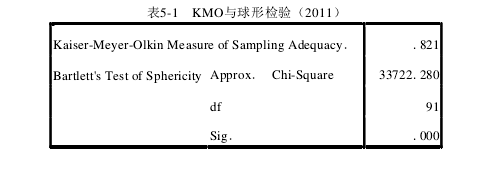 為消除所選 14 個衡量財務價值的指標所包含的信息具有相關性的影響,在進行回歸分析前,對 14 個指標進行了因子分析。下文以 2011 年為例簡述因子分析過程,2012、2013、2014 年數據分析相關表格見附錄。 第一,通過 KMO  檢驗和  Bartlett’s  假設檢驗,這一過程是為了驗證所選指標是否適合做因子分析。表 5-1 為 2011 年財務指標的檢驗結果,KMO 數值為 0.821,適合做因子分析。本文 2011—2014 年 KMO 數值分別 0.821、0.592、0.686、0.726,表示本文所構建的指標體系適合做因子分析。第二,用主成分分析法提取主要因子,表 5-2 顯示了 2011 年各因子的方差貢獻率和累計方差貢獻率。以 2011 年為例,根據提取特征根大于 1 的方法,前五個因子的累計方差貢獻率達到 81.55%,說明前五個因子已經可以解釋上述 14 個指標中的絕大部分信息。但是綜合衡量 2011—2014 的數據提取因子的情況,為了保持一致性,我們最終確定選擇 8 個主因子。這 8 個主因子對原有 14 個指標的累計方差貢獻率分別達到了 98.502%、82.297%、89.103%、87.476%,表示所提取的主因子能夠解釋原有 14 個指標中絕大部分的信息。因此,可以把它們作為評價上市公司財務績效的主要評價指標,分別表示為 F1、F2、F3、F4、F5、F6、F7、F8。