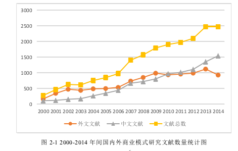 基于對文獻檢索平臺的權威性及其對數據庫與期刊的涵蓋率等因素的考慮,本文選取“ISI Web of Science”作為英文文獻檢索平臺,選取“中國知網”(CNKI)作為中文文獻檢索平臺,以“商業模式(Business Model)”為主題詞,時間跨度為2000 年到 2014 年,共檢索到文獻 20269 篇,其中外文文獻 10464 篇,中文文獻9805 篇。根據檢索結果,繪制出 2000-2014 年間國內外商業模式研究文獻數量統計圖(圖 2-1),從圖 2-1 中可以看到,關于商業模式的研究成果在這十幾年間飛速增加,從 2000 年的 276 篇上升到 2014 年的 2475 篇。對比外文文獻和中文文獻的折線圖可以發現,國內對商業模式的研究滯后于國外,但從 2010 年開始,國內每年關于商業模式的文獻數量已經超過了國外,至于質量如何需要進一步地分析。此外,觀察外文文獻數量的折線圖可以發現,從 2009 年開始,國外每年關于商業模式的文獻數量保持穩定,說明國外對于商業模式的研究開始進入冷靜期。