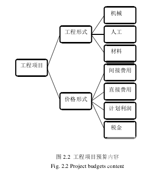 在一般的企業中,首先是簽訂合同,委托方以認為合理的價格選定施工方,施工方在保證工程順利完工的基礎上讓自己獲得合理的利益。施工方在做項目預算時,必須要知道具體施工過程,算出合理的資金需求量,同時也要制定出如何分配所得資金,如何有效的利用這筆資金,使資金實現最大效益。在施工過程中要保證既不會造成資金鏈的中斷,也不能預留過多的資金。 工程項目是一個復雜的系統,為了使施工企業預算方便,可將項目工程預算的內容大致分為兩中形式,如圖 2.2 所示。預算書中分別以工程形式和價格形式表現出具體的工程量與價值。以工程形式來劃分,其中,機械費用主要包括在施工的過程中,設備租賃費、消耗費、修理費、施工機械的進出場費、轉移費以及裝卸費。人工費主要包括不同工種的工人價格以及參與項目人員的獎金、津貼等。材料費用包括實際工作中所需要的原材料、零件、配件、半成品以及運輸與存儲、消耗的費用。 如果以價格形式表現,那么工程項目的成本可以分為固定費用和可變費用。企業的管理費用、固定資產折舊費以及職工的培訓費等,這樣不會隨著工程量的增加而增加的資金叫做固定成本。相反的,隨著工程量的增加而增加的成本叫做可變成本,它主要有材料、現場經費、臨時設施費、財務費用、冬、雨季施工增加費、夜間施工增加費、所得稅、特殊地區施工津貼費等。