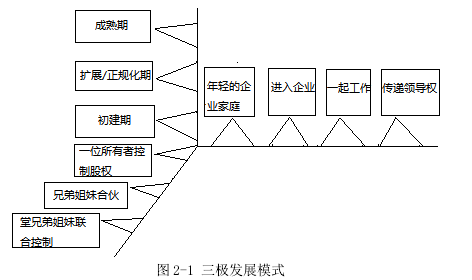 在家族企業內部,由于家族因素不斷滲透,導致其較一般企業的治理結構更加錯綜繁復,對企業成長的作用機制也更加難以把握,國內外這方面的研究也有許多代表性的觀點。 國外學者不管在理論還是實踐方面對家族企業治理和成長關系的探討都顯得更加深入和完善,學術界公認相關方面代表性的觀點有: 美國相關研究專家 Gersick et al.(1997)構筑成一個“三環模型”即家庭、所有權、企業三者組成的彼此交叉又各自獨立的組織系統,通過系統能夠明確各成員在家族企業中的角色類型,彼此間的權利界限、職責與沖突,便于我們通過分析家族企業內部各子系統的相互作用關系,不斷完善公司的治理結構以協調各方的利益和矛盾。“三環模型”是一個靜態的系統,由于事物是動態變化的,Gersick et al.(1999)在“三環模型”的基礎上,進一步擴展為“三極發展模式”,該理論也被認為是探究家族企業成長相關議題的理論基礎。所謂“三極發展模式”就是通過企業、家庭、所有權三個維度來分析家族企業成長的動態過程中各維度的演進歷程與維度空間角色交替問題。家族企業在所有權、企業及家庭三條軸線上的具體演進軌跡如下圖(如圖 2-1 所示):