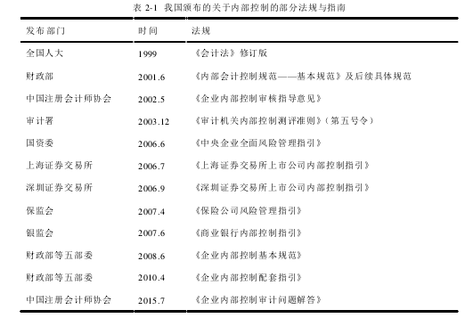 我國企業的內部控制長期以來一直處于“諸侯割據”的狀態,很多部門都積極參與了企業內部控制制度的建設工作,先后頒布了許多關于內部控制的法律、法規(具體見表2-1)。我國企業內部控制的發展大體可以分為兩個階段:第一個階段為學習和探索階段(1949-2005),第二個階段為發展與創新階段(2006-至今)。 在學習與探索階段,從內部控制的內涵與目標來看,主要有以下特點,其一《會計法》對內部控制有一定的約束力,但僅限于會計控制層面,并未形成一個內部控制體系框架的概念;其二內部控制的內涵和目標具有明顯的行業特色,都是針對特定行業的企業設定的,從整體上看,缺乏一個統一的、權威的、綜合的內部控制概念體系;三是內部控制的定位參差不齊,有的是會計控制,有的是內部控制,有的是風險控制,總體上定位比較低,也沒有形成一個大家都認可和接受的定位;其四是關于內部控制的內涵和目標,借鑒了 COSO內部控制框架,同時結合了本行業特色。 內部控制的原則方面,這一階段確定了內部控制的一些原則性問題,并已形成框架體系的重要組成部分。我國對內部控制的基本原則雖然各自已經形成了一些體系,也達成了一些共識,但各部門的法規之間以及同一部門的前后法規之間還存在不一致、不協調的地方,還具有一定的行業特點。 從內部控制的內容與結構來看,主要有以下特點,一是內部控制的內容范圍日漸豐富,不僅包括會計控制,也涉及到風險管理和管理控制,最大的特色就是行業特征明顯;二是中國的內部控制結構不盡相同,大體分為實務型、框架結構型和框架與實務相結合型,即中國并未形成統一的內部控制框架;三是在構成要素和結構上,基本上都與 COSO 內部控制框架的結構和要素類似,但具體內容又存在一些差別。