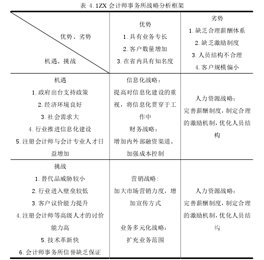 本文通過閱讀戰略管理的相關書籍和搜集到的關于 ZX 會計師事務所的資料,以“案例分析-建議對策”的思路對事務所人力資源戰略和信息化戰略在未來的提出建議對策。 根據對 ZX 會計師事務所的人員結構、2010 年至 2015 年的收入和在河北省的排名情況、客戶規模、業務類型的分析,以及對 ZX 會計師事務所外部宏觀環境和行業環境的剖析,本文將 ZX 會計師事務所目前的問題歸納按照優勢、劣勢、機遇、挑戰進行分類,得出 ZX 會計師事務所可供選擇的戰略有:信息化戰略、人力資源戰略、營銷戰略、財務戰略、業務多元化戰略??紤]到 ZX 會計師事務所目前的規模和運營成本問題,本文認為信息化戰略和人力資源戰略是 ZX 會計師事務所目前最應重視和實施的戰略,其他戰略也不容忽視,可作為信息化戰略和人力資源戰略實施的輔助戰略,共同實現 ZX會計師事務所做大做強的總體戰略。人力資源戰略可通過制定有吸引力的薪酬體系、建立有層次的激勵機制、優化人員結構來實現;信息化戰略的實現路徑可以從將信息化建設貫穿于業務工作始終、加強管理信息化、增加信息技術人才三個角度切入。