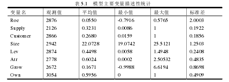 研究所涉及的主要變量的描述性統計結果見表 5.1。由表可知,樣本公司總體的凈資產收益率(Roe)均值為 5.5%,最小值和最大值分別為-79.16%和 57.65%,可見制造業公司的凈資產收益率的差異較大,并且普遍偏低。供應商集中度(Supply)和客戶集中度(Customer)的均值分別為 32.31%和 26.80%,說明總體而言,前五大供應商集中度約為 1/3,前五大客戶集中度達到 1/4 以上,但是供應商和客戶集中度的最大值與最小值之間的差距較大,其中 Supply 最小值為 0.86%,不足 1%,最大值達到 100%,Customer 最小值為 1.59%,最大值為 100%,表明,制造業內不同上市公司對供應商和客戶的依賴程度存在很大的差距。最小極端值的產生可能是由于公司處于供應鏈的終端,對上游或下游的依賴較小,如公司生產的產品主要靠自主研發,其自身可以為自己提供材料來源,因此對供應商的依賴性較??;也可能企業所生產產品市場占有率大,競爭者較少,所以對客戶的依賴性較小。最大極端值的產生可能是由于部分企業具有特殊的產品特性,形成了資產專用性,因此供應商和客戶單一,業務伙伴集中度較高。 公司規模(Size)方面,由于對總資產已取對數,差異不大。資產負債率(Lev)方面,均值為 44.98%,處于較低水平,并且公司之間的差異較大,最小值為 0.58%,最大值為 149.48%,處于資金利用率不充分和嚴重資不抵債狀態??傎Y產周轉率(Atr)均值為 0.6024,并且最小值與最大值之間差異較大,說明制造業企業的總資產周轉率偏低,有待提高。營業收入增長率(Grow)方面,均值為 16.71%,說明小部分公司處于快速成長階段,大部分仍然處在低成長階段。