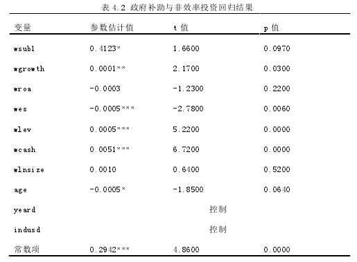 下表 4.1 為論文實證模型中一些關鍵和主要變量的相關性分析。從下表 4.1得出,政府補助、營業收入增長率、資產收益率水平、銷售費用率、每股現金流與存在非效率投資的民營上市公司價值均在 1%的水平上顯著正相關;資產負債率水平、公司規模等與非效率投資的民營上市公司的價值均在 1%的水平上顯著負相關,這說明政府補助對提升非效率投資類民營上市公司的公司價值具有明顯效果,公司成長性、盈利能力等均能提升公司價值,過高的財務杠桿對公司價值起到負面效果、降低了公司的價值。政府補助、營業收入增長率、資產負債率、公司規模、每股現金流與非效率投資行為都存在顯著的正相關關系,銷售費率水平與非效率投資行為在 1%水平上存在顯著負相關性,這說明成長性好、現金充裕公司更容易導致非效率投資問題的發生。下表 4.2 為民營上市公司政府補助與非效率投資的回歸結果。從表中得出,民營上市公司政府補助與非效率投資行為存在顯著的正相關關系,這表明民營上市公司獲得政府補助資金在一定程度上加重了非效率投資問題,這驗證政府“ 掠奪之手” 相關理論,政府補助并未能真正起到提高資金的投資效率及改善民營上市公司整體非效率投資現狀的效果。公司的營業收入增長率、資產負債率水平、每股經營活動產生的現金流量凈額、公司規模均與非效率投資存在顯著正相關性,這表明成長性越良好、資產負債率水平越高、現金流越充足、規模越大的民營上市公司,越容易導致非效率投資行為的加大。政府補助一方面加大自由現金流充裕公司的非效率投資行為;另一方面,也會導致一些公司高管過度自信、盲目擴張及投資行為的發生,這些行為會進一步加劇民營上市公司的非效率投資問題,這驗證了 H1,即政府補助對民營上市公司的投資扮演了 “掠奪之手”角色。