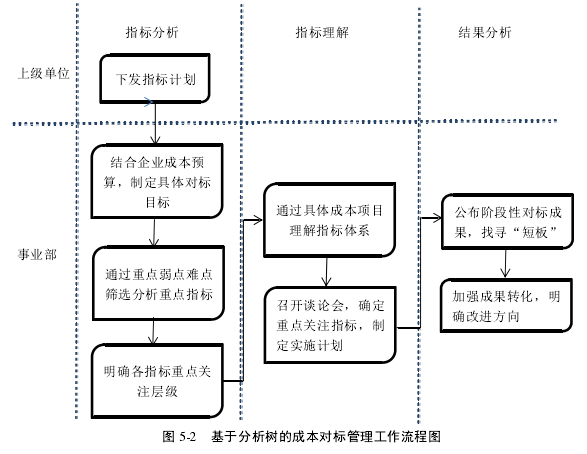 (2)使對標管理職責清晰明確 通過完善事業部成本對標管理組織結構和相關對標管理辦法,更加具體明確事業部各部門在成本對標管理過程中所承擔的職責,加強全員、全過程、全項目成本對標的管理認識,讓成本對標不單僅是財務人員的工作,更要向其他環節、其他部門、其他工作人員延伸。