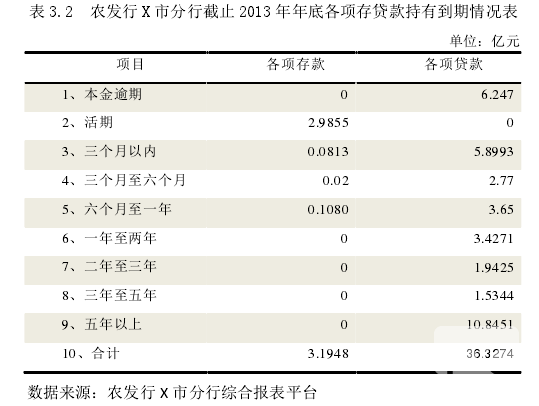 X 市位于我國中部,地屬黃土高原,屬欠發達地區,轄內共有縣、市區 10 余個,總面積 2.5 萬平方公里,地形以丘陵、山地為主,其中耕地面積為 974 萬畝。全市總人口為 310 萬,其中農村人口 215 萬。該市市區及周邊兩縣地屬盆地,是該省糧食主產區之一,其中玉米產量占全市糧食總產量的四分之三,其余縣則均為山地、丘陵,多以小雜糧種植為主。同時該市西部四縣羊養殖在附近區域內較為出名,羊年出欄近150 余萬只,除滿足轄內羊肉需求外,多銷往外地。雖然 X 市近年來經濟發展增速較快,高于其所在省平均水平,但由于基礎弱,基數小,因此整體經濟發展水平在全省排名墊后。2013 年,X 市地區生產總值完成 654.7億元,同比增長 9%,總量僅占到全省的 5%;財政總收入完成 144.1 億元,同比下降0.1%,其中公共財政預算收入完成 73.7 億元,同比增長 13.1%;財政收入總量在全省位列倒數第三,其中公共財政預算收入僅占到全省總量的 4%;城鎮居民人均可支配收入 20324 元,同比增長 9.9%,農民人均純收入 5423 元,同比增長 13.6%,總量處在全省末位。X 市也是全國較為貧困的地區之一,其所轄縣、市中有 11 個屬國家扶貧開發重點縣。農發行 X 市分行于 1996 年 12 月從該市農行劃分出來,成為了該市唯一一家農業政策性銀行,成立之初全行職工人數為 212 人,目前正式職工 204 人。中共黨員 139名,占比為 68.1%;男女職工比例基本持平;從學歷構成上看,具有大專及以上學歷的為 162 人,占比 76%,具有碩士學歷的僅為 5 人,占比為 2.4%;全轄員工平均年齡42.7 歲,其中 50 歲以上 56 人,占 27.5%;30 歲以下 61 人,占 29.9%,其中近 4 年招錄本科及以上學歷人員共計 26 人,極大的改善了該行的年齡結構和學歷機構。