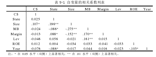 當自變量之間存在較強的相關性時,會出現多重共線性的問題。為了檢驗自變量之間是否存在多重共線性,運用 SPSS 對 8 個變量大股東持股比例(CS)、股權性質(State)、公司規模(Size)、賬面市值比(MB)、控股邊際(Margin)、財務杠桿(Lev)、凈資產收益率(ROE)、年份(Year)進行相關分析。由于 Logistic 模型對多重共線性較為敏感,自變量之間較高的相關性會影響模型可靠性,因此本文對自變量的相關性進行了檢驗,結果如表5-1 所示。如列表 5-1 所示,各自變量間的相關性不高,相關系數的絕對值最高的為公司規模(Size)與賬面市值比(MB)的 0.275,雖在 0.01 水平上達到顯著相關,但未超過 0.3,為低度相關,表示本研究中所有自變量之間沒有較高的相關性。因此就不需要考慮多重共線性,所以本文在回歸分析因變量時可以用 Logistic 模型。