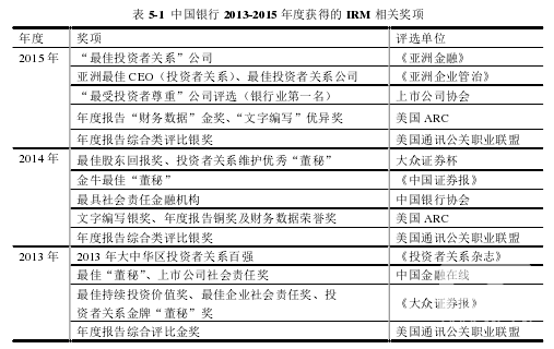 隨著我國資本市場的發展,IRM 日益受到上市公司管理層的重視,甚至將 IRM作為公司內部治理的重要部分。就目前情況而言,我國上市商業銀行在 IRM 實踐方面仍存在很多不足,整體水平參差不齊,但也不乏成功的案例。其中,中國銀行的 IRM工作在國內銀行業,甚至是整個資本市場中較為先進,并多次獲獎,其成功經驗對于上市商業銀行完善 IRM 工作具有很大的借鑒意義。