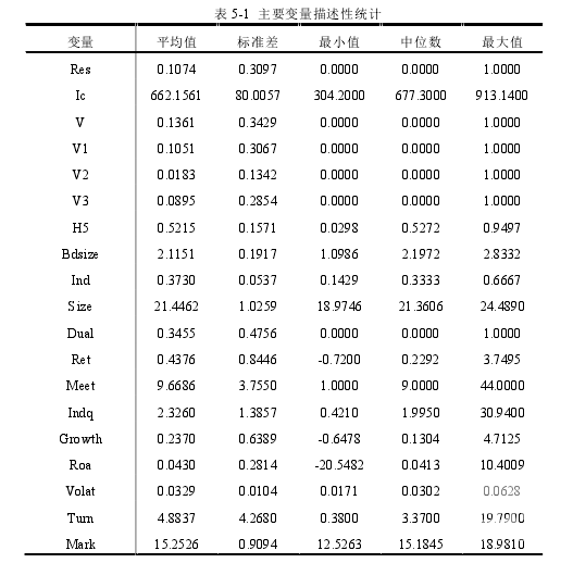 表 4-4  列示了變量的描述性統計結果。公司違規(V)平均值為 0.1361,可以看出樣本中每 100 個觀測樣本中存在 13.61 個違規行為。具體而言,經營與領導人違規(V2)的樣本最少,平均為 1.83%。相反的,企業信息披露違規(V1)最為嚴重,平均每 100 個企業的觀測樣本中,高達到 10.5 個違規樣本,是經營與領導人違規樣本數量的 5.73 倍。這可能與經營與領導人違規的后果大多比較嚴重有關,而信息披露違規的成本相比之下會較輕,所以企業一般不敢隨意觸碰經營與領導人違規行為的高壓線。除了這兩類違規,還有其他類型違規(V3),平均值為 8.95%,介于信息披露違規與經營和領導人違規之間。三種違規類型平均值的總和為21.28%,約為違規樣本(V)平均值的兩倍,說明企業的違規行為,經常是涉及多個方面的違規,而不是單一方面的違規行為。其他變量中,Res 的均值為 0.107,說明樣本中實際控制人擁有境外居留權的人數約為 10.7%,此觀察結果與梁娟(2015)、金智(2015)對實際控制人境外居留權的研究樣本結果一致。上市公司內部控制指數(Ic)在不同企業之間差別較大,標準差為 80.01,最大值為 304.3,中位數為 677.3,最大值為 913.1,說明我國民營上市企業的內部控制質量具有明顯的優劣差異。在股權結構方面,前五大股東的持股比例之和的均值為 52.10%。說明我國民營企業前五大股東持股比例普遍比較集中。在獨立董事方面,樣本中獨立董事比例(Ind)最高為 66.67%,最低為 14.29%,相差 4.67 倍,說明上市企業中對待獨立董事問題的差異非常大,基于現有的文獻研究,普遍認為高比例的獨立董事能夠更好的約束企業的行為。董事會會議(Meet)次數也同樣是監控企業行為的一種手段,但在我國上市企業中,董事會會議次數的差異巨大,最少的企業一年只開一次董事會,而召開董事會會議次數最多的企業竟達到一年 44 次,這對企業信息披露的具有極大的影響。在公司盈利水平上來看,資產收益率(Roa) 的體現了不同企業之間的取得凈利潤能力的差異,而均值為 4.3%,凈利潤均值偏低,由此推斷體我國民營企業大多數技術含量不高,以人工勞動力為主的制造業。
