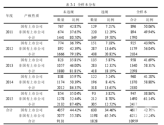 本文選取 2011-2015 年在滬深兩市交易的 A 股上市公司為初始樣本,樣本篩選遵循以下原則:1)剔除 ST、*ST、金融保險業等具有特殊性質以及數據異常和數據不全的上市公司;2)同一公司在不同年度的違規視為獨立樣本,在同一年度多次違規視為單次考慮。違規年度根據國泰安“中國上市公司違規處理研究數據庫”的“違規信息總表”中的“違規年度”字段予以判斷。本文的被解釋變量公司違規以及公司規模、股票持有期年收益率、總資產凈利潤率、資產負債率、董事會規模、獨立董事比例、董事長與總經理兼任情況等控制變量來源于國泰安(CSMAR)數據庫,產權性質與流通股年換手率來源于色諾芬(CCER)數據庫,機構投資者持股比例來源于同花順(i Fin D)數據庫。所有數據利用 Excel 2010 和 SPSS 19.0 完成數據整理和回歸分析。