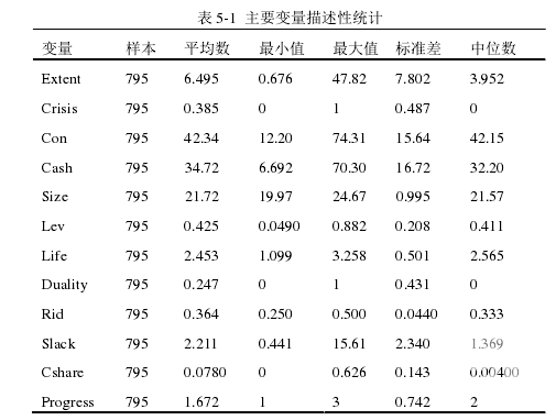 本文研究了 2002—2015 年我國 A 股上市家族企業的數據,經過多輪的收集篩選共取得 134 家企業,795 個觀測樣本。在這部分樣本中,本文根據家族企業接班二代在企業高管團隊中的職位變動情況,對每個家族企業所處代際傳承階段進行了詳細的劃分。根據統計,截止 2015 年,在本文所選取的 134 家之中,有 66家上市家族企業處于代際傳承第一階段(參與管理階段),一代仍然把握著企業經營發展的主體方向,占總樣本的 49.25%;有 44 家家族企業已經進入共同管理階段,接班二代已經擔任公司的總經理,在公司經營中起著關鍵作用,這一部分樣本占了 32.84%;而樣本中僅有 24 家上市家族企業完成了代際傳承,處于接收管理階段,接班二代擔任公司的董事長,完全負責企業的經營管理,這一部分企業占了總樣本的 17.91%。從上述樣本初步可以看出,我國上市家族企業完全完成代際傳承的企業數量還是不多,大部分在代際傳承進程中的上市家族企業都還處于參與管理階段。所以,如果更好的避免傳承危機的發生,完成代際傳承的任務,對每個家族企業都顯得十分重要。 本文所涉及的主要變量描述性統計如表 5-1 所示,主要包括了回歸模型中的主要變量的樣本數、平均值、最大值、最小值、標準差和中位數。本文主要研究的被解釋變量傳承危機(Crisis)為虛擬變量,取值為 0 或 1,平均值為 0.385,說明在整體樣本中發生傳承危機的樣本數量要少于沒有發生傳承危機的樣本。傳承危機程度(Extent)的最大值和最小值分別為 47.82 和 0.676,說明代際傳承中的不同家族企業財務健康程度相差較大。而主要解釋變量控制家族終極控制權(Con)和控制家族現金流權(Cash)最大值與最小值之間同樣相差較大,標準差分別為 15.64 和 16.72,反映了不同上市家族企業控股家族對企業的控制程度有著較為顯著的差距。有些企業選擇高度控制家族企業,而有些企業則選擇相對開放的股權結構,吸引更多的投資者投資到家族企業中。在控制變量上,不同家族企業的規模、財務杠桿、成立年限以及公司治理情況都有明顯的不同。公司資產負債率(Lev)最大值和最小值分別為 0.882 和 0.049,說明不同上市家族企業的舉債程度差異較大,有些公司會有高額的負債,而有些公司則會采用較少舉債的策略?;旧?,主要變量的描述性統計還是與現實狀況相符,沒有出現特別異常的數據。